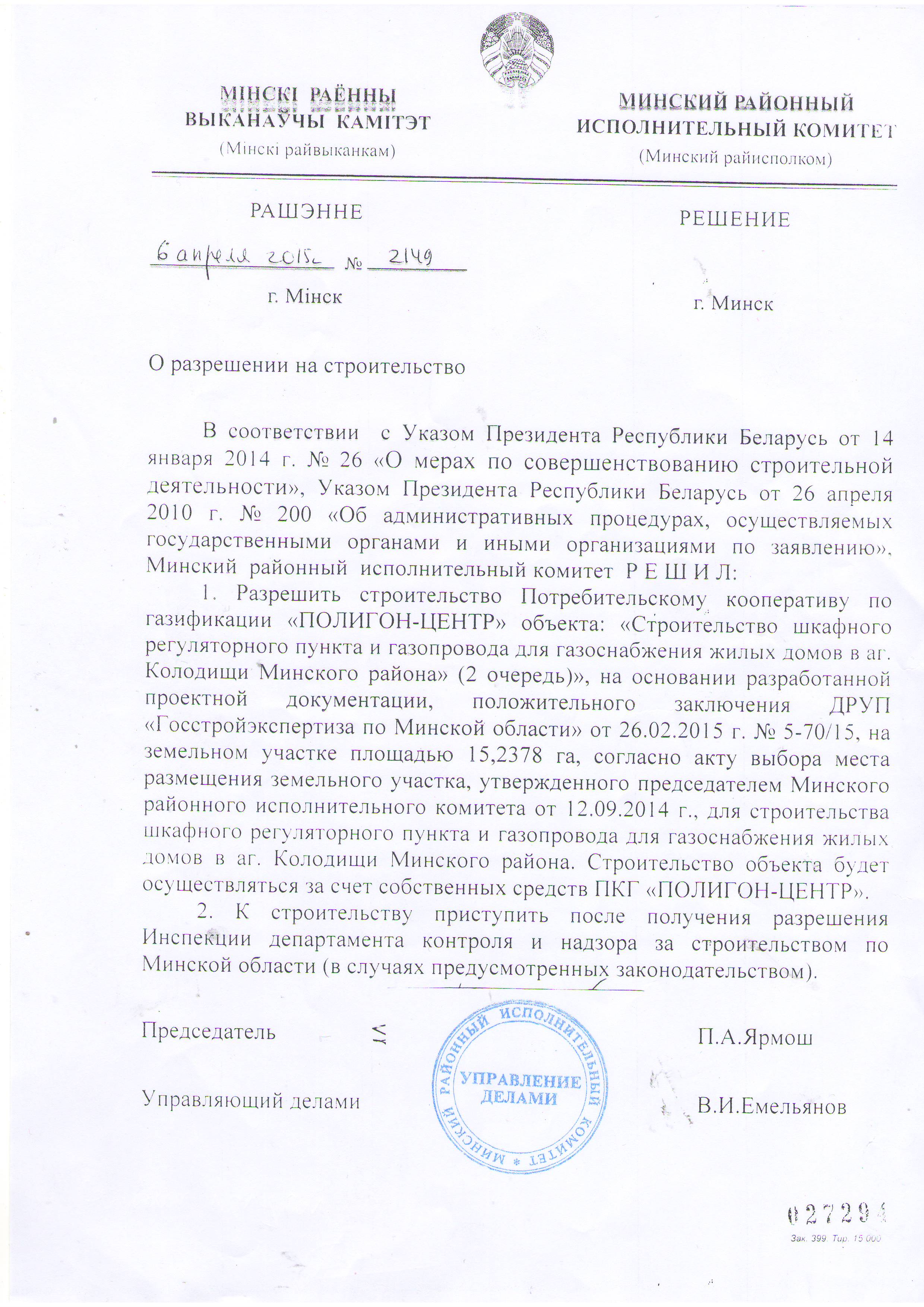 Разрешение на строительство получено (Решение минского райисполкома №2149 от 06.04.2015)